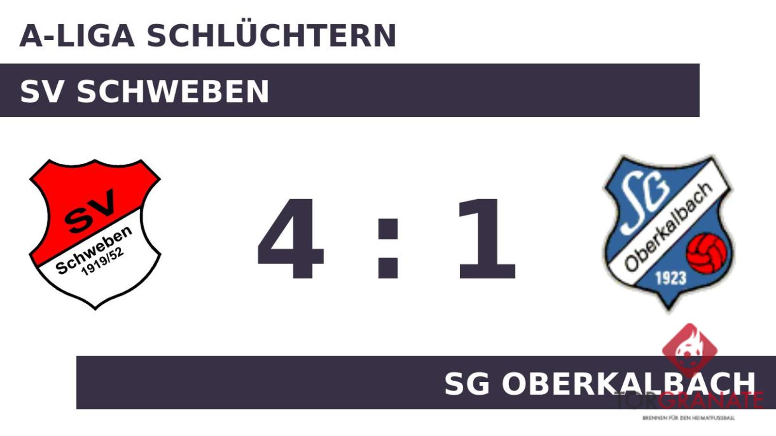 Durch einen Elfmeter von Marvin Stey gelang dem SVS das Führungstor. Nach nur 28 Minuten verließ Philipp Engler von der SG Oberkalbach das Feld, Marcel Schulz kam in die Partie. Die Oberkalbacher kamen durch ein Eigentor des SV Schweben in der 37. Minute zum Ausgleich. Zur Halbzeit war die Partie noch vollkommen offen. Remis lautete das Zwischenresultat. In der Pause stellte der SV Schweben personell um: Per Doppelwechsel kamen Marius Schmidt und Dennis Sorg auf den Platz und ersetzten Kevin Perez und Stey. Moritz Heil versenkte die Kugel zum 2:1 (68.). In der 77. Minute brachte Louis Auth das Netz für den SV Schweben zum Zappeln. Florian Storch baute den Vorsprung der Schwebener in der 90. Minute aus. Am Ende verbuchte der SV Schweben gegen die SG Oberkalbach einen Sieg.