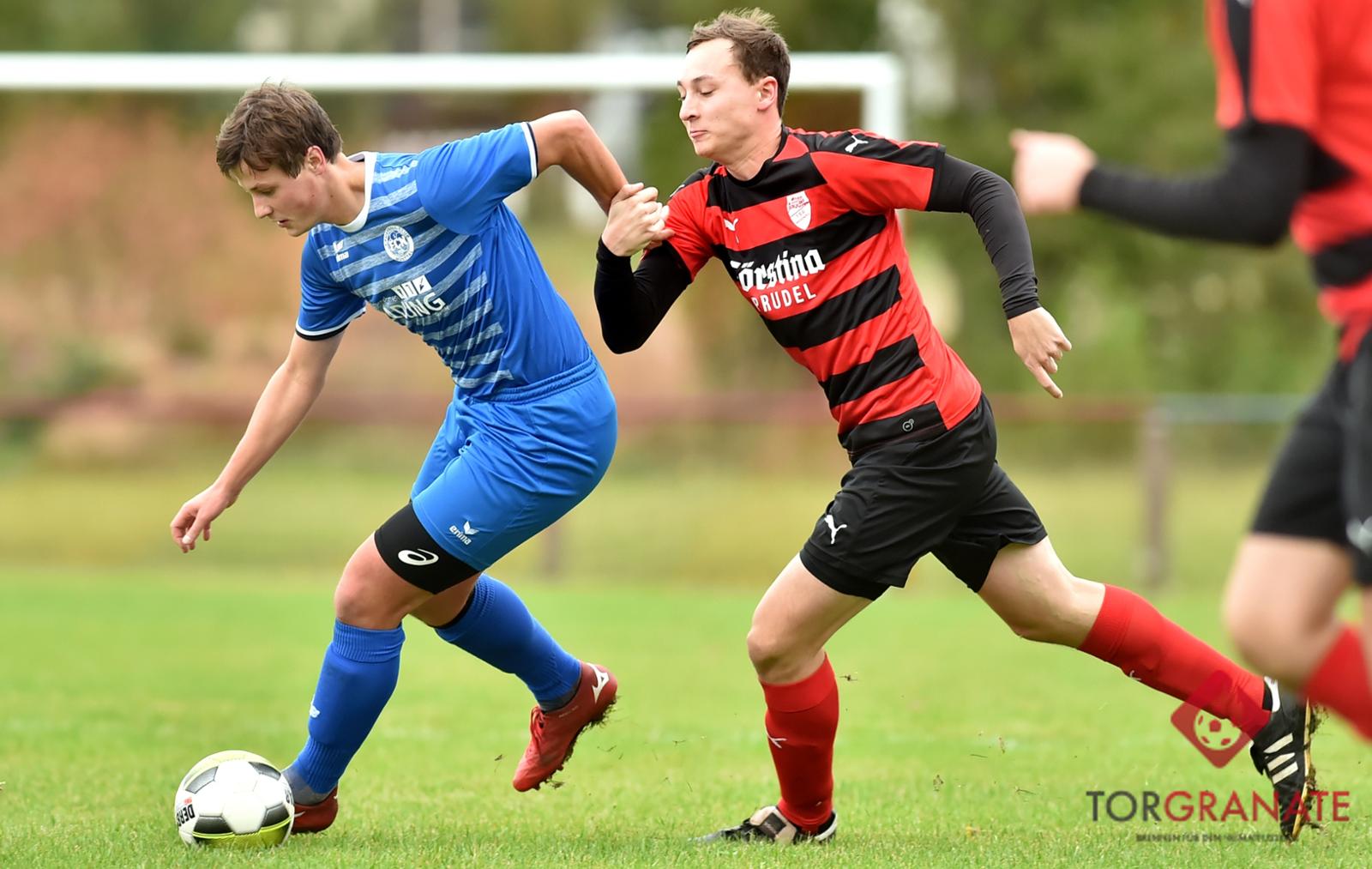 Der Nüsttaler Julian Arend (blau) behauptet gegen Jan Philipp Meyer (Mackenzell) den Ball. Foto: Charlie Rolff