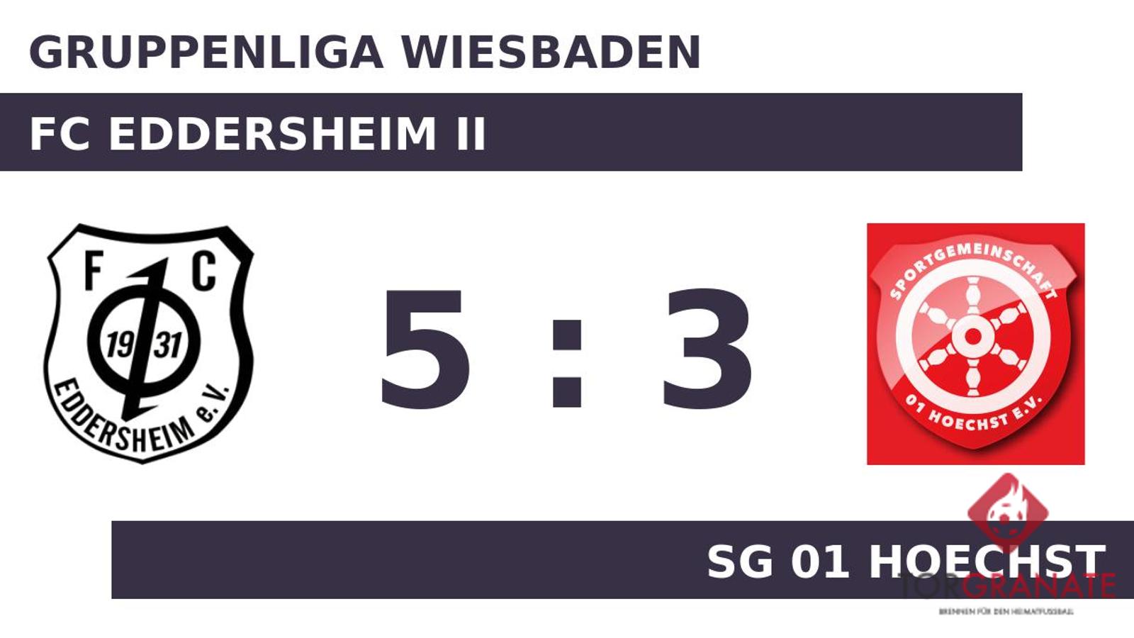 Für den Führungstreffer des FC Eddersheim II zeichnete Jason Ptak verantwortlich (25.). Justin Matthews ließ sich in der 34. Minute nicht zweimal bitten und verwertete zum 1:1 für die SG 01 Hoechst. Zur Halbzeit war die Partie noch vollkommen offen. Remis lautete das Zwischenresultat. Bei der SG 01 Hoechst kam zu Beginn der zweiten Hälfte Raffael Grigorian für Nikola Colovejic in die Partie. Hristos Papazois versenkte die Kugel zum 2:1 (54.). Grigorian witterte seine Chance und schoss den Ball zum 2:2 für die SG 01 Hoechst ein (63.). Der FC Eddersheim II drängte im Verlauf auf die Entscheidung – Marco Filipovic (79.), Niklas Voit (82.) und Aiki Koyama (84.) machten der SG 01 Hoechst den Garaus. Kurz vor dem Ende des Spiels nahm der FC Eddersheim II noch einen Doppelwechsel vor, sodass Fabian Pessel und Benjamin Beciragic für Misaki Haruyama und Filipovic weiterspielten (87.). Turgay Akbulut beförderte das Leder zum 3:5 der SG 01 Hoechst über die Linie (89.). Am Schluss fuhr der FC Eddersheim II gegen den Gast auf eigenem Platz einen Sieg ein.