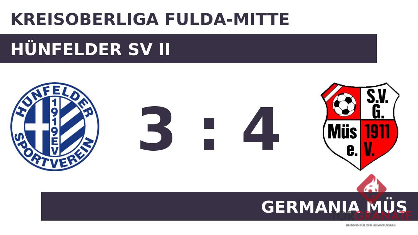 Julian Keller brachte den SV Müs in der 13. Minute in Front. Wenige Momente vor dem Seitenwechsel war Luca Jan Gaertner mit dem 2:0 für die Germania zur Stelle (42.). Kurz vor dem Pausenpfiff erhöhte Noah Hubl den Vorsprung des SVM auf 3:0 (45.). Die Überlegenheit der Müser spiegelte sich in einer deutlichen Halbzeitführung wider. Mit dem 4:0 von Gaertner für den Gast war das Spiel eigentlich schon entschieden (50.). Für das 1:4 des Hünfelder SV II zeichnete Marvin Rützel verantwortlich (67.). Trotz einer deutlichen Leistungssteigerung im Verlauf der Partie schaffte es der HSV nicht mehr, etwas Zählbares zu erringen.