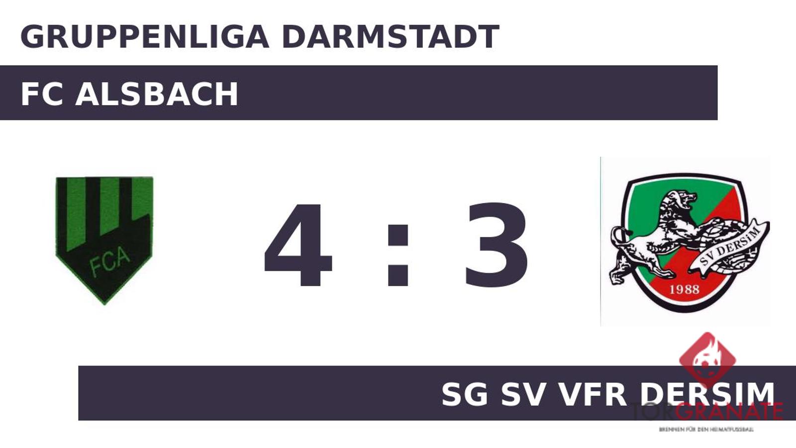Der FC Alsbach ging per Elfmeter von Jordan Dörr in Führung (30.). Johannes Wolff verwandelte in der 35. Minute einen Elfmeter und baute den Vorsprung des FCA auf 2:0 aus. Wenige Momente vor dem Seitenwechsel war Abouzaho Kone mit dem 1:2 für SG SV VfR Dersim zur Stelle (44.). Zum psychologisch wichtigen Zeitpunkt kurz vor der Halbzeit (45.) traf Mohamed Amin Kouraji zum Ausgleich für den Gast. Bei SG SV VfR Dersim änderte sich die Aufstellung für die zweite Halbzeit. Sora Osawa ersetzte Giuseppe Carbone. Nennenswerte Szenen blieben bis zum Seitenwechsel aus, sodass das Zwischenergebnis auch zu Beginn des zweiten Durchgangs Bestand hatte. Ogün Ünal witterte seine Chance und schoss den Ball zum 3:2 für SG SV VfR Dersim ein (64.). Für SG SV VfR Dersim nahm das Match in der Schlussphase eine bittere Wende. Hakim Faeq und Riccardo D Addona drehten den Spielstand (84./90.) und sicherten dem FC Alsbach einen Last-Minute-Sieg. Letztlich nahm der FC Alsbach gegen den direkten Abstiegskonkurrenten wichtige Punkte mit und trug einen Sieg davon.