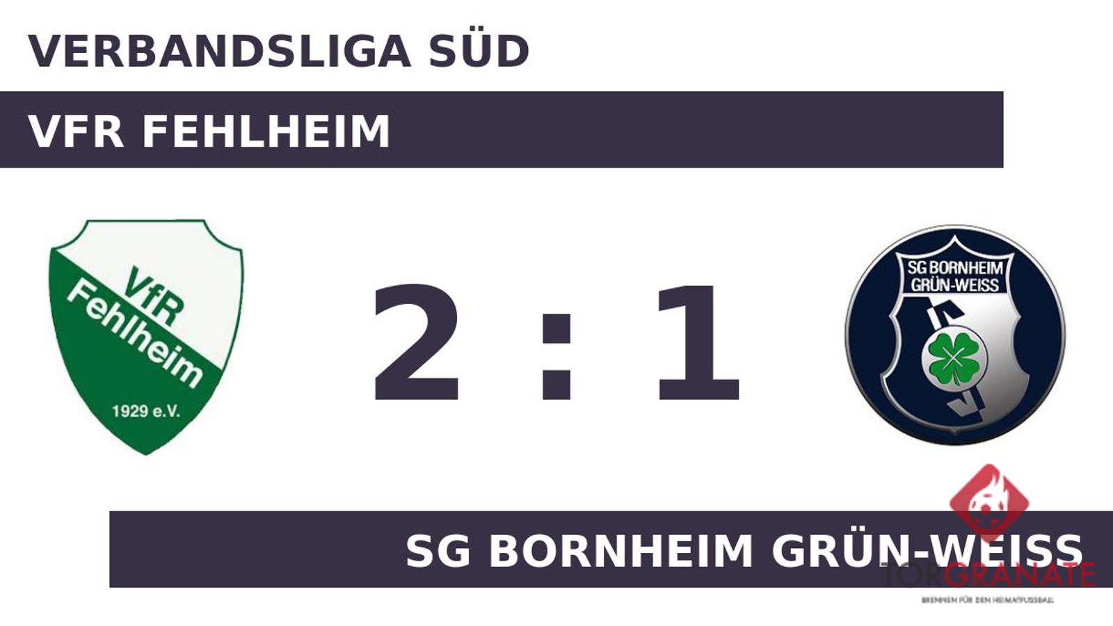 Für den Führungstreffer des VfR Fehlheim zeichnete Evangelos Politakis verantwortlich (11.). Wenige Momente vor dem Seitenwechsel war Luke Steinmetz mit dem 2:0 für den Gastgeber zur Stelle (45.). Mit der Führung für den VfR Fehlheim ging es in die Kabine. Der VfR Fehlheim musste den Treffer von Ben Becker zum 1:2 hinnehmen (74.). Obwohl dem VfR Fehlheim nach erfolgreicher erster Hälfte keine weiteren Tore gelangen, schaffte es die SG Bornheim Grün-Weiss zugleich nicht, die Partie zu drehen. Sie endete mit 2:1.