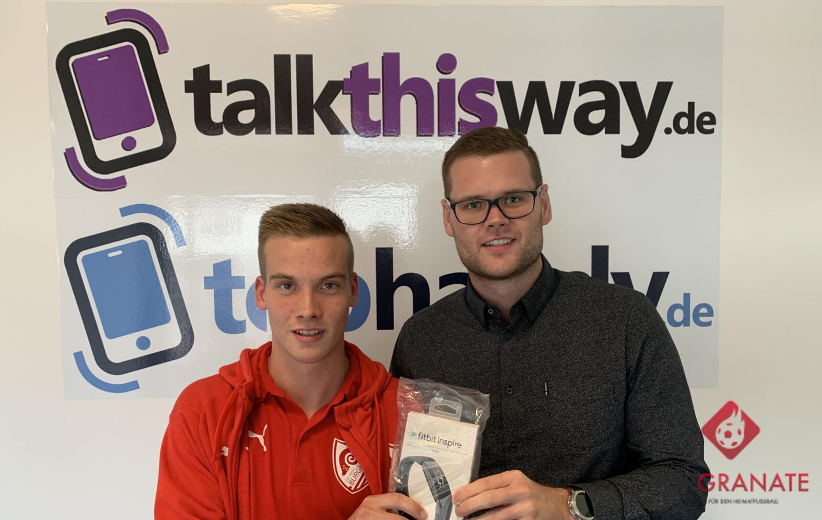 Burghauns Fabian Hutfleß (links) erhält aus den Händen von Dennis Theisenroth von unserem Partner "tophandy.de" seine Fitnessuhr. Foto: Christian Halling