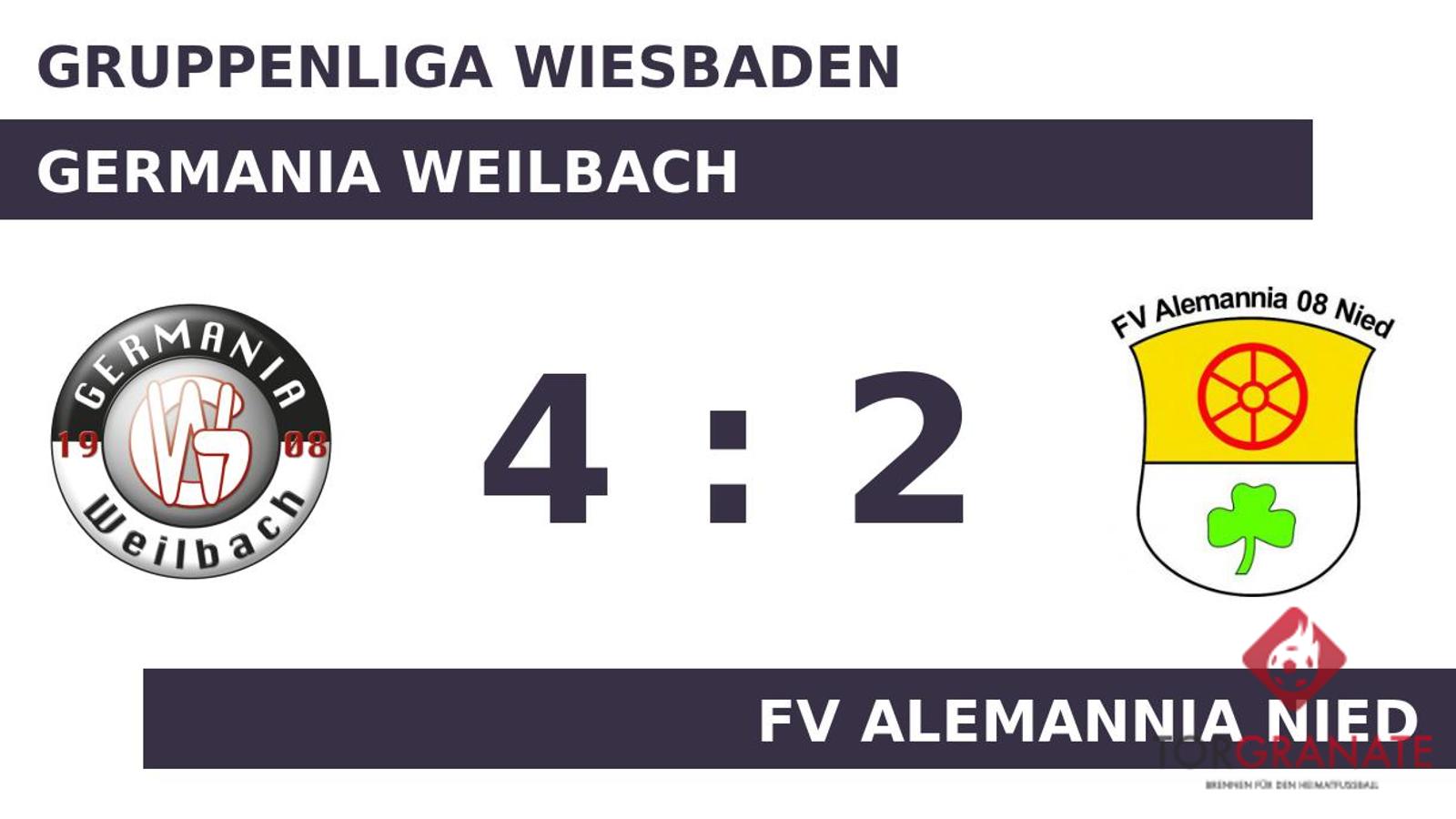 Der FV Alemannia Nied legte los wie die Feuerwehr und ließ durch einen Doppelschlag von Raul Rodriguez-Arenella aufhorchen (2./13.). Das letzte Tor der turbulenten Startphase markierte Marvin David Wuntke in der 20. Minute. Im ersten Durchgang hatte der FV Alemannia Nied etwas mehr Zug zum Tor und ging mit einem knappen Vorsprung in die Kabine. Der Gast stellte in der 62. Minute mit einem Dreifachwechsel groß um und schickte Bilal El Gouy, Daniel Spiegel und Edward Mensah-Bonsu für Kevin Wille, Rodriguez-Arenella und Spiegel auf den Platz. Das 2:2 der Germania Weilbach stellte Pierre Alusse sicher (73.). Dass das Heimteam in der Schlussphase auf den Sieg hoffte, war das Verdienst von k. A, der in der 74. Minute zur Stelle war. In der 85. Minute verwandelte Christoph Hame einen Elfmeter zum 4:2 für die Germania Weilbach. Referee Emre Can (Reinheim) beendete schließlich das Spiel und somit kassierte der FV Alemannia Nied eine schmerzliche Niederlage gegen einen direkten Konkurrenten im Abstiegskampf.