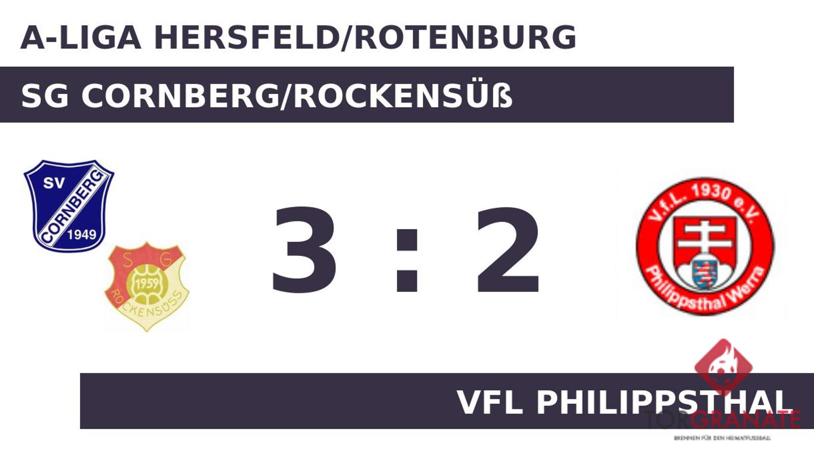 Der VfL geriet schon in der dritten Minute in Rückstand, als Dominik Baum das schnelle 1:0 für Cornberg/Rockensüß erzielte. In der 20. Minute brachte Jan Bettenhausen das Netz für die SG Cornberg/Rockensüß zum Zappeln. Mit der Führung für die SG ging es in die Halbzeitpause. Der VfL Philippsthal kehrte stark verändert aus der Kabine zurück. Statt Joachim Wagner, Joshua Weitz und Federico Stiebing standen jetzt Marius Ruppel, Philipp Annecke und Leon Brueckner auf dem Platz. Durch einen von Tim Ruch verwandelten Elfmeter gelang den Philippsthaler in der 56. Minute der 1:2-Anschlusstreffer. Manuel Toro Moreno erhöhte für Cornberg/Rockensüß auf 3:1 (59.). Bei der Spielgemeinschaft ging in der 80. Minute der etatmäßige Keeper Yannic Gutwein raus, für ihn kam Pascal Janus. Mit dem 2:3 gelang Ruch ein Doppelpack – an der Niederlage änderte dies jedoch auch nichts mehr (90.). Schließlich strich die SG Cornberg/Rockensüß die Optimalausbeute gegen den VfL Philippsthal ein.