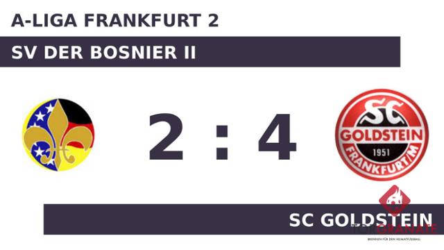 Dennis Winter schoss in der zwölften Minute vom Elfmeterpunkt das erste Tor des Spiels für den SC Goldstein. Ilias Kharrati schoss die Kugel zum 2:0 für die Gäste über die Linie (23.). Kurz vor dem Seitenwechsel legte Robin Kind das 3:0 nach (40.). Kurz vor der Pause traf Amir Grabovica für SV der Bosnier II (45.). Es waren die Gäste, die zur Pause eine Führung ihr Eigen nannten. Mit dem 4:1 von Timon Knapp für den SC Goldstein war das Spiel eigentlich schon entschieden (48.). SV der Bosnier II verkürzte den Rückstand in der 68. Minute durch einen Elfmeter von Linus Dogan auf 2:4. Unter dem Strich verbuchte der SC Goldstein gegen SV der Bosnier II einen 4:2-Sieg.