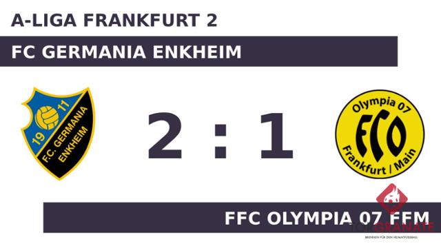 Abderrahim Amsiouji brachte den FFC Olympia 07 Ffm per Doppelschlag ins Hintertreffen, als er in der 25. und 37. Minute vollstreckte. Mit der Führung für den FC Germania Enkheim ging es in die Kabine. Beim FFC Olympia 07 Ffm kam zu Beginn der zweiten Hälfte Stefan Carreno für Laurenz Haas in die Partie. Der FC Germania Enkheim konnte mit dem ersten Durchgang sehr zufrieden sein. Trotzdem gab es Veränderungen bei den Germanen. Peter Zeidler ersetzte Shawn-Meikel Wrede, der nun schon vorzeitig Feierabend machte. In der 65. Minute brachte Simon Schmidt den Ball im Netz der Germania unter. Obwohl dem FCG nach erfolgreicher erster Hälfte keine weiteren Tore gelangen, schaffte es der FFC Olympia 07 Ffm zugleich nicht, die Partie zu drehen. Sie endete mit 2:1.
