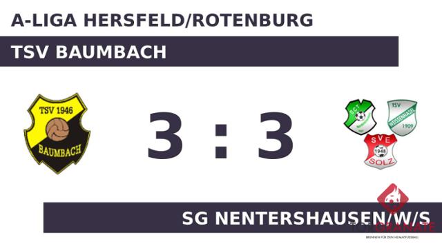 Das 1:0 der SG NWS bejubelte Rico Muhlack (20.). Tobias Fischer ließ sich in der 29. Minute nicht zweimal bitten und verwertete zum 1:1 für den TSV Baumbach. Torben Bämpfer versenkte die Kugel zum 2:1 (39.). Aus der Ruhe ließ sich die SG Nentershausen/W/S nicht bringen. Muhlack erzielte wenig später den Ausgleich (44.). Zur Pause stand ein Unentschieden, und für beide Mannschaften war noch alles drin. Eine Minute später ging der TSV Baumbach durch den zweiten Treffer von Bämpfer in Führung. Jan Schenck traf zum 3:3 zugunsten der SG NWS (72.). Mit dem Abpfiff des Referees Georg Mühling (Neukirchen) trennten sich der TSV Baumbach und die SG Nentershausen/W/S remis.