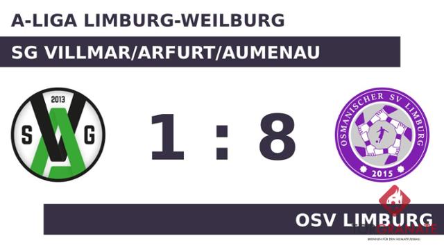 Ferhat Kesmen brachte die Gäste in der 38. Spielminute in Führung. Kurz vor dem Halbzeitpfiff (43.) baute Volkan Özel die Führung des OSV Limburg aus. Es waren die Gäste, die zur Pause eine Führung ihr Eigen nannten. Kesmen überwand den gegnerischen Schlussmann zum 3:0 für den OSV Limburg (47.). Emre Cengiz baute den Vorsprung des OSV Limburg in der 49. Minute aus. Doppelpack für den OSV Limburg: Nach seinem ersten Tor (62.) markierte Muhammed Ali Simsek wenig später seinen zweiten Treffer (65.). Ali-Reza Kazerooni (77.) und Halil Aytekin (83.) brachten den OSV Limburg mit zwei schnellen Treffern weiter nach vorne. Die SG Villmar/Arfurt/Aumenau kam kurz vor dem Ende durch Patrick Zanner zum Ehrentreffer (90.). Der OSV Limburg überrannte das Villmar/Arfurt/Aum. förmlich mit acht Toren und fährt so mit einem verdienten Sieg in der Tasche nach Hause.