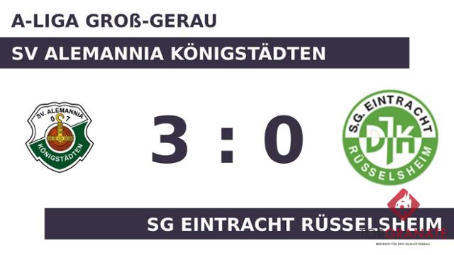 Tim Gimmnich trug sich in der 15. Spielminute in die Torschützenliste ein. Weitere Tore gab es bis zum Pausenpfiff nicht und so ging es mit der Führung des SV Al. Königstädten in die Kabine. Daniel Akmadzic erhöhte für den Gastgeber auf 2:0 (85.). Noah Grewatsch brachte den Tabellenprimus in ruhiges Fahrwasser, indem er das 3:0 erzielte (87.). Am Schluss siegte der SV Alemannia Königstädten gegen SG Rüsselsheim.