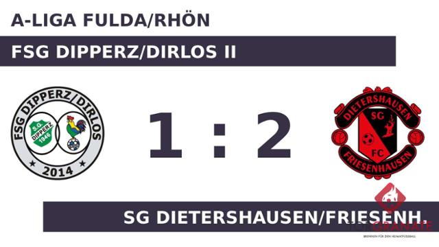 Nach nur 25 Minuten verließ Jan Luca Braukhoff von der FSG DiDi II das Feld, Nico Steinhauer kam in die Partie. Vor dem Seitenwechsel sorgte Jannik Schleicher mit seinem Treffer für eine kalte Dusche für die FSG. Ein Tor auf Seiten von Dietershausen/F. machte zur Pause den Unterschied zwischen den beiden Mannschaften aus. Mit einem Wechsel – Patrik Reinhardt kam für Richard Obeng – startete die SG in Durchgang zwei. Die FSG Dipperz/Dirlos II geriet deutlicher in Rückstand, als Schleicher nach Vorlage von Louis Henkel auf 2:0 für die SG Dietershausen/Friesenh. erhöhte (52.). Die FSG DiDi II markierte das 1:2 (54.). Unter dem Strich verbuchte Dietershausen/F. gegen DiDi einen 2:1-Sieg.