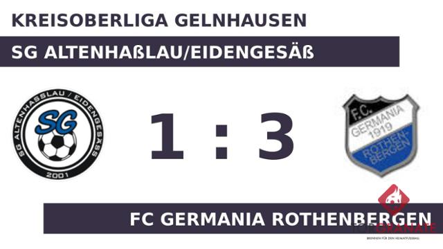 Das Altenhaßlau/Eid. geriet schon in der vierten Minute in Rückstand, als Tim Noll das schnelle 1:0 für die Germ. Rothenbergen erzielte. Lange währte die Freude des FC Germania Rothenbergen nicht, denn schon in der sechsten Minute schoss Christoph Geiger den Ausgleichstreffer für die SG Altenhaßlau/Eidengesäß. Nennenswerte Szenen blieben bis zum Seitenwechsel aus, sodass das Zwischenergebnis auch zu Beginn des zweiten Durchgangs Bestand hatte. Yannic Weidenbörner brachte der Germ. Rothenbergen nach 89 Minuten die 2:1-Führung. Ehe der Abpfiff ertönte, war es Andreas Roeller, der das 3:1 aus Sicht des FCG perfekt machte (90.). Schließlich strich der FC Germania Rothenbergen die Optimalausbeute gegen das Altenhaßlau/Eid. ein.