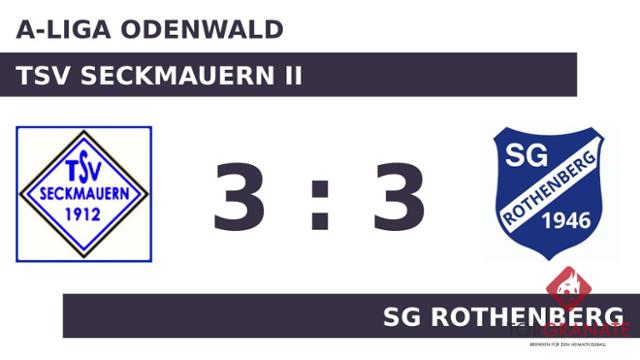 Christian Verst versenkte die Kugel zum 1:0 (12.). Durch ein Eigentor der SG Rothenberg verbesserte der TSV Seckmauern II den Spielstand auf 2:0 für sich (15.). Per Elfmeter erhöhte Verst in der 28. Minute seine Torausbeute an diesem Tag auf zwei Treffer – 3:0 für den TSV Seckmauern II. Rico Johe verkürzte für die SG Rothenberg später in der 36. Minute auf 1:3. Mit der Führung für den TSV Seckmauern II ging es in die Kabine. In der 67. Minute erzielte Janis Fink das 2:3 für die SG Rothenberg. Die komfortable Halbzeitführung des TSV Seckmauern II hielt nicht bis zum Abpfiff, denn Tom Bulling schoss den Ausgleich in der 68. Spielminute. Gedanklich hatte der TSV Seckmauern II den Sieg bereits sicher, doch eine famose Aufholjagd sicherte der SG Rothenberg am Ende noch den Teilerfolg.