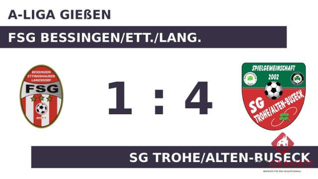 Nicolas Dieter Hahn versenkte den Ball in der 14. Minute im Netz der FSG Bessingen/Ett./Lang. Wer glaubte, der Gastgeber sei geschockt, irrte. Christoph Gröbl machte unmittelbar nach dem Rückschlag den Ausgleich perfekt (15.). Das letzte Tor der turbulenten Startphase markierte Vedat Kocas in der 21. Minute. Komfortabel war die Pausenführung der Trohe/Alten-Buseck nicht, aber immerhin ging der Gast mit einem Tor Vorsprung in die Umkleidekabinen. Hahn schnürte mit seinem zweiten Treffer einen Doppelpack und brachte seine Mannschaft auf die Siegerstraße (56.). Für ruhige Verhältnisse sorgte Pascal Magiera, als er das 4:1 für die SG Trohe/Alten-Buseck besorgte (65.). Am Schluss schlug die Trohe/Alten-Buseck die FSG Bess./Ett./Lang. mit 4:1.