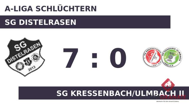 Rene Lang brachte die SG Distelrasen in der achten Minute in Front. Bereits in der 13. Minute erhöhte Lars Kouba den Vorsprung der Distelrasener. Mit dem 3:0 von Daniel Fritz für die Dreier-SG war das Spiel eigentlich schon entschieden (23.). Die Überlegenheit der Dreier-Spielgemeinschaft spiegelte sich in einer deutlichen Halbzeitführung wider. Die SG Kressenbach/Ulmbach II kam mit einer geänderten Formation aus der Kabine zurück: Jan-Luca Zeller war für Marcel Klug zur Stelle. Mit dem 4:0 durch Luca Müller schien die Partie bereits in der 54. Minute mit der SG Distelrasen einen sicheren Sieger zu haben. Der Gastgeber baute die Führung aus, indem Hendrik Heil zwei Treffer nachlegte (57./61.). Jens Kouba besorgte in der Schlussphase schließlich den siebten Treffer für den Spitzenreiter (85.). Schlussendlich setzte sich die SG Distelrasen mit sieben Toren durch und machte bereits vor dem Seitenwechsel klar, welche Mannschaft als Sieger vom Platz gehen würde.