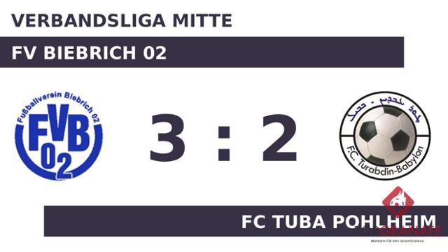 Orkan Beslen brachte sein Team in der 38. Minute nach vorn. Einen Torerfolg in Halbzeit eins verbuchte lediglich der FC TuBa, womit man eine knappe Führung mit in die Kabinen nahm. Nazeem Aboubakari ließ sich in der 59. Minute nicht zweimal bitten und verwertete zum 1:1 für den FV Biebrich 02. Elias Walter brachte den Ball zum 2:1 zugunsten der Biebricher über die Linie (62.). Das 3:1 für die Nullzweier stellte Aboubakari sicher. In der 71. Minute traf er zum zweiten Mal während der Partie. Kurz vor Ultimo war noch Marius Klotz zur Stelle und zeichnete für das zweite Tor des FC TuBa Pohlheim verantwortlich (90.). Mit dem Schlusspfiff durch Schiedsrichter Simon Wecht (Heppenheim (Bergstraße)) siegte der FV Biebrich 02 gegen den FC TuBa.
