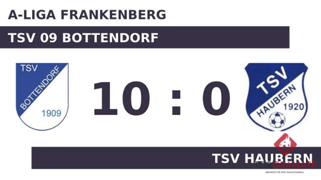 Für das erste Tor sorgte Lukas Becker. In der 23. Minute traf der Spieler des TSV Bottendorf ins Schwarze. Andreas Thiele erhöhte für die Gastgeber auf 2:0 (24.). Sebastian Best legte in der 34. Minute zum 3:0 für den Tabellenprimus nach. Alexander Tissen gelang ein Doppelpack (41./45.), mit dem er das Ergebnis auf 5:0 hochschraubte. Dem TSV Haubern gelang in der ersten Halbzeit gar nichts, sodass man zur Pause weit hinter dem TSV 09 Bottendorf zurück lag. Den Vorsprung des TSV Bottendorf ließ Tissen in der 47. Minute anwachsen. Alexander Tissen vollendete zum siebten Tagestreffer in der 48. Spielminute. Für den TSV Haubern war es ein Tag zum Vergessen. Best (67.), Andres Tissen (79.) und Nils Feyerabend (90.) machten das Unheil perfekt. Wenig später kamen Josel Strauch und Patrick Loewe per Doppelwechsel für Alexander Tissen und Becker auf Seiten des TSV 09 Bottendorf ins Match (69.). Am Ende ließ der TSV Bottendorf kein gutes Haar am TSV Haubern und gewann außerordentlich hoch.
