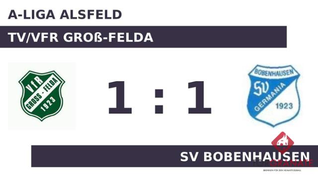 Tim Roeper brachte den TV/VfR Groß-Felda in der 31. Minute ins Hintertreffen. Zur Pause behielt der SV Bobenhausen die Nase knapp vorn. Für das 1:1 des TV/VfR Groß-Felda zeichnete Niklas Zeuner verantwortlich (54.). Am Ende trennten sich die Heimmannschaft und der SV Bobenhausen schiedlich-friedlich.