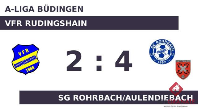 Der VFR Rudingshain ging durch einen Elfmeter von Dennis Fritzges in Führung (7.). In der 14. Minute verwandelte Finn Schaefer dann einen Elfmeter für die SG Rohrbach/Aulendiebach zum 1:1. Das letzte Tor der turbulenten Startphase markierte Kevin Scheller in der 30. Minute. Der VFR Rudingshain war gewillt auszugleichen. Bis zum Seitenwechsel sprang jedoch nichts Zählbares mehr heraus. Daniel Bauer erhöhte den Vorsprung der Rohrbach/Aulendieb. nach 62 Minuten auf 3:1. Das 2:3 des VFR Rudingshain stellte Sascha Nicodemus sicher (80.). Mit dem 4:2 sicherte Scheller der SG Rohrbach/Aulendiebach nicht nur den Sieg, sondern erzielte auch seinen zweiten Tagestreffer (87.). Am Schluss gewann die Rohrbach/Aulendieb. gegen den VFR Rudingshain.