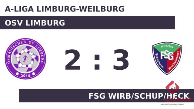 Kaum war das Spiel angepfiffen, lag die FSG Wirb/Schup/Heck bereits in Front. Marcel Pfeiffer markierte in der vierten Minute die Führung. Volkan Özel versenkte den Ball in der 33. Minute im Netz des Gasts. Zur Halbzeit war die Partie noch vollkommen offen. Remis lautete das Zwischenresultat. Tom Illgen stellte die Weichen für die FSG Wirb/Schup/Heck auf Sieg, als er in Minute 50 mit dem 2:1 zur Stelle war. Das 2:2 des OSV Limburg bejubelte Muhammed Ali Simsek (71.). Der Schlusspfiff war zum Greifen nah, als Ognjen Zoric noch einen Treffer parat hatte (90.). Schließlich strich die FSG Wirb/Schup/Heck die Optimalausbeute gegen den OSV Limburg ein.