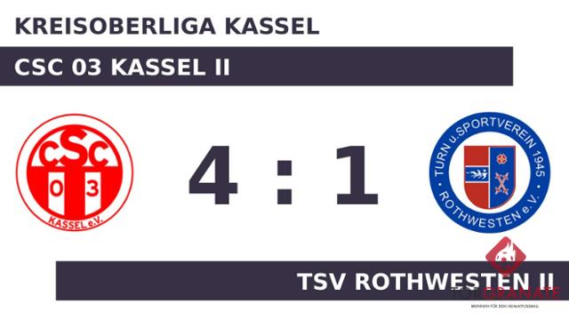 Nevzat Kominov brachte den TSV Rothwesten II in der 34. Minute ins Hintertreffen. Joolaal Abdule Sabriye schoss die Kugel zum 2:0 für den CSC 03 Kassel II über die Linie (39.). Mit der Führung für das Heimteam ging es in die Kabine. Mit einem Wechsel – Dylan Demirsoy kam für Maximilian Scholl – startete der TSV Rothwesten II in Durchgang zwei. Mit dem 3:0 von Kominov für den CSC 03 Kassel II war das Spiel eigentlich schon entschieden (47.). In der 61. Minute brachte Ibrahim Tunc das Netz für den TSV Rothwesten II zum Zappeln. In der 82. Minute stellten die Gäste personell um: Per Doppelwechsel kamen Sascha Schulz und Mohammad Sadegh Ebrahimi auf den Platz und ersetzten Mehmet Isilak und Lukas Geisler. Ehe der Abpfiff ertönte, war es Kominov, der das 4:1 aus Sicht des CSC 03 Kassel II perfekt machte (90.). Als Schiedsrichter Jürgen Backhaus (Steinheuterode) die Begegnung beim Stand von 4:1 letztlich abpfiff, hatte der CSC 03 Kassel II die drei Zähler unter Dach und Fach.