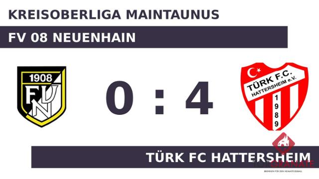 Mario Pavic stellte die Weichen für den Türk FC Hattersheim auf Sieg, als er in Minute sechs mit dem 1:0 zur Stelle war. In der Zeit bis zur Pause fiel kein weiteres Tor, es blieb bei der Führung für die Gäste. Wenig später kamen Frederik Zimmermann und k. A. per Doppelwechsel für Dennis Kreutzmann und k. A. auf Seiten des FV 08 Neuenhain ins Match (54.). Jackie Reljic brachte den Ball zum 2:0 zugunsten des Türk FC Hattersheim über die Linie (55.). Den Vorsprung des Türk FC Hattersheim ließ Lamin Neneh Tamba in der 79. Minute anwachsen. Irfan Kandic vollendete zum vierten Tagestreffer in der 85. Spielminute. Am Schluss siegte der Türk FC Hattersheim gegen den FV 08 Neuenhain.