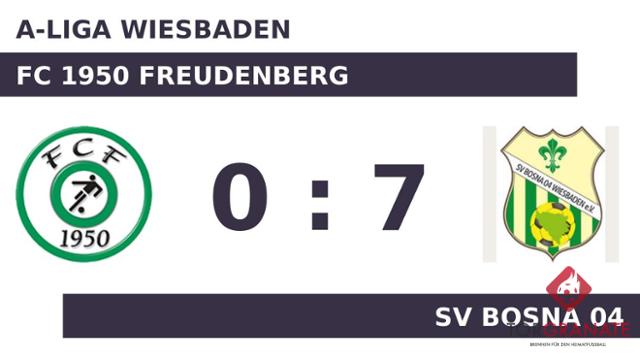 Das 1:0 des SV Bosna 04 stellte Elmin Kurtisi sicher (23.). Abas Mukhtar Mahamud versenkte die Kugel zum 2:0 für die Gäste (27.). Der Halbzeitpfiff war noch nicht ertönt, als Kurtisi seinen zweiten Treffer nachlegte (40.). Per Elfmeter erhöhte Mahamud in der 44. Minute seine Torausbeute an diesem Tag auf zwei Treffer – 4:0 für den SV Bosna 04. Die Überlegenheit des SV Bosna 04 spiegelte sich in einer deutlichen Halbzeitführung wider. In der Halbzeit nahm der SV Bosna 04 gleich zwei Wechsel vor. Fortan standen Hasan Dzinic und Armin Sabanovic für Redouan Haddouzi und Aladin Pilica auf dem Platz. Zum Seitenwechsel ersetzte Lennart Rossmann vom FC 1950 Freudenberg seinen Teamkameraden Marvin Ettingshausen. Der SV Bosna 04 zeigte auch weiterhin keine Gnade. So schossen Dzinic (53./78.) und Sabanovic (70.) drei weitere Treffer. Ercan Basaran (Frankfurt am Main) pfiff schließlich das Spiel ab, in dem der SV Bosna 04 bereits in Durchgang eins deutlich gezeigt hatte, dass es nach 90 Minuten nur einen Sieger geben würde.
