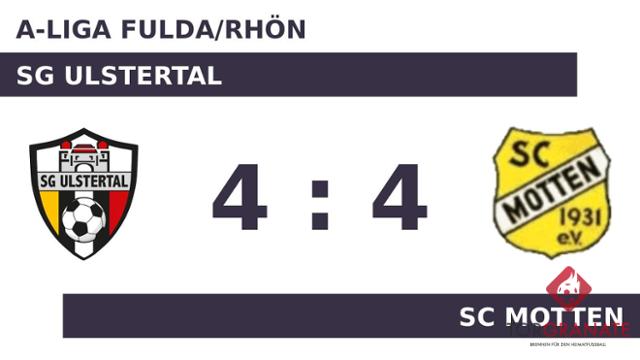Für das erste Tor sorgte Niko Schreiner. In der zweiten Minute traf der Spieler des SC Motten ins Schwarze. Daniel Wagner war es, der in der 21. Minute den Ball im Tor des SCM unterbrachte. Steffen Trabert nutzte die Chance für die SG Ulstertal und beförderte in der 39. Minute das Leder zum 2:1 ins Netz. Im ersten Durchgang hatte die SGU etwas mehr Zug zum Tor und ging mit einem knappen Vorsprung in die Kabine. Per Elfmeter erhöhte Wagner in der 48. Minute seine Torausbeute an diesem Tag auf zwei Treffer – 3:1 für die SG. Es folgte der Anschlusstreffer für den SC Motten – bereits der zweite für Schreiner. Nun stand es nur noch 2:3 (74.). Emmanuel Magova erhöhte den Vorsprung der SG Ulstertal nach 81 Minuten auf 4:2. Durchsetzungsstark zeigte sich der SC Motten, als Tom Kreiß (88.) und Schreiner (90.) schnell nacheinander im gegnerischen Strafraum zuschlugen. Am Ende stand es zwischen der SG Ulstertal und dem SC Motten pari.