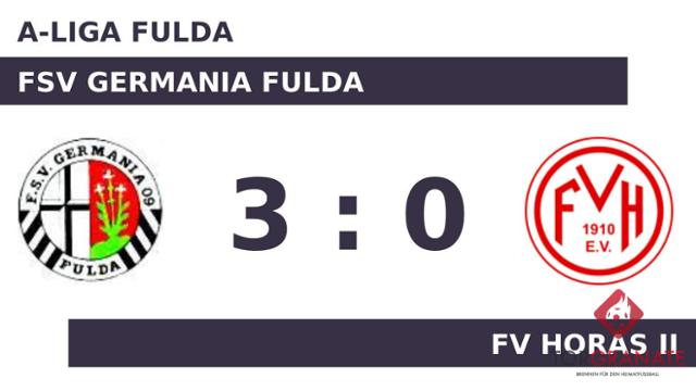 Vor dem Seitenwechsel sorgte Andrej Arendt mit seinem Treffer für eine kalte Dusche für den FV Horas II. Zur Pause wusste der FSV Germania Fulda eine hauchdünne Führung auf der Habenseite. Zu Beginn des zweiten Durchgangs ging bei der Germania Jan Hoffmann für Andreas Horn zu Werke, beide sind für die gleiche Position nominiert. Für das 2:0 des FSV zeichnete Samer Ahmed verantwortlich (53.). Für ruhige Verhältnisse sorgte Adrian Happe, als er das 3:0 für die Fuldaer besorgte (63.). Unter dem Strich verbuchte Germania Fulda gegen den FV Horas II einen 3:0-Sieg.