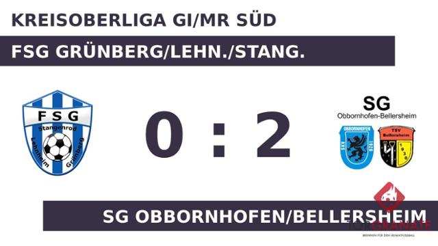 Nach den ersten 45 Minuten ging es für die FSG Grünberg/Lehn./Stang. und die SG Obbornhofen/Bellersheim ohne Torerfolg in die Kabinen. Paul Ortmann brach für das Obbornh./Bellersh. den Bann und markierte in der 65. Minute die Führung. In der 70. Minute erhöhte Tim Hufnagel auf 2:0 für den Gast. Nach Beendigung der zweiten Halbzeit hieß das Ergebnis 2:0 zugunsten des Tabellenführers.
