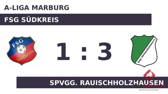 Das erste Tor des Spiels ging an die Gäste. Allerdings gelang dies nur mithilfe der FSG Südkreis: 1:0 für die Spvgg. Rauischholzhausen durch ein Eigentor in der 19. Minute. Das Rauischholzhausen führte zur Halbzeit knapp mit einem Tor Vorsprung. Daniel Hoeck erhöhte den Vorsprung des Tabellenprimus nach 48 Minuten auf 2:0. Andre Traut vollendete zum dritten Tagestreffer in der 50. Spielminute. In der 56. Minute stellte die Spvgg. Rauischholzhausen personell um: Per Doppelwechsel kamen Robin Ebinger und Leonard Usbeck auf den Platz und ersetzten Tim Brunet und Tristan Walther. In der 75. Minute brachte Lukasz Patryk Jankowski das Netz für die FSG Südkreis zum Zappeln. Nach der Beendigung des Spiels durch Schiedsrichter Michael Linker (Rauschenberg) feierte das Rauischholzhausen einen dreifachen Punktgewinn gegen die FSG Südkreis.