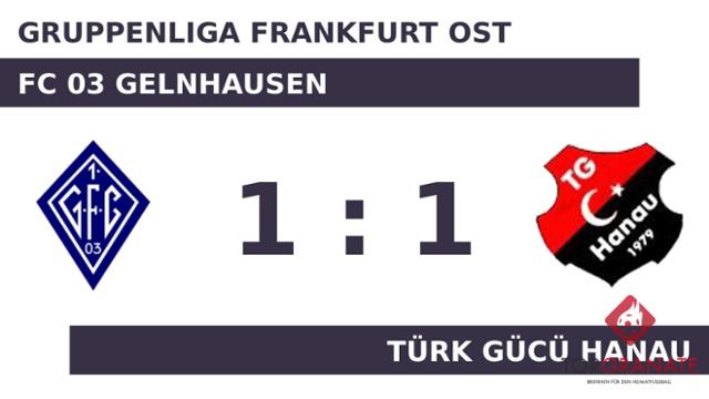 Ausgerechnet zum psychologisch ungünstigen Zeitpunkt vor der Halbzeit traf Tolunay Özelci für Türk Gücü zur Führung (42.). Einen Torerfolg in Halbzeit eins verbuchte lediglich TG, womit man eine knappe Führung mit in die Kabinen nahm. In der Pause stellte der FC 03 Gelnhausen personell um: Per Doppelwechsel kamen Justin Langhammer und Adrian Köpf auf den Platz und ersetzten Martin Pinker und Patrick Kalis. Benedikt Kreß traf zum 1:1 zugunsten des FC 03 (74.). Am Ende trennten sich die Gelnhäuser und Türk Gücü Hanau schiedlich-friedlich.
