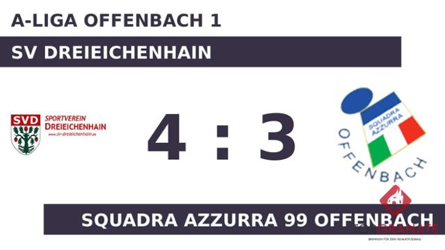 Giuseppe Savoca brachte die Squadra Azzurra OF in der 15. Minute nach vorn. Davide Altomari beförderte das Leder zum 2:0 der Squadra Azzurra 99 Offenbach über die Linie (30.). Krzysztof Pawlik war es, der in der 34. Minute den Ball im Tor der Squadra Azzurra OF unterbrachte. Als manch einer bereits mit den Gedanken in der Halbzeitpause war, besorgte Hammad Geith auf Seiten des SV Dreieichenhain das 2:2 (45.). Zum Seitenwechsel hatte keine Mannschaft die Oberhand gewonnen. Unentschieden lautete der Zwischenstand. Florian Landzettel stellte die Weichen für den SV Dreieichenhain auf Sieg, als er in Minute 50 mit dem 3:2 zur Stelle war. Khalid Belkasmi witterte seine Chance und schoss den Ball zum 3:3 für die Squadra Azzurra 99 Offenbach ein (70.). Acht Minuten später ging der SV Dreieichenhain durch den zweiten Treffer von Geith in Führung. Die Squadra Azzurra OF hatte alle Trümpfe in der Hand, verspielte im Verlauf jedoch eine komfortable Führung und büßte letztlich eine bittere Niederlage ein.