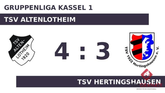 Torben Garthe brachte den TSV Altenlotheim in der elften Minute in Front. Das Heimteam musste den Treffer von Jan Kraus zum 1:1 hinnehmen (19.). Nico Backhaus nutzte die Chance für den TSV Altenlotheim und beförderte in der 39. Minute das Leder zum 2:1 ins Netz. Zur Pause wusste der TSV Altenlotheim eine hauchdünne Führung auf der Habenseite. Philipp Prantschke sicherte dem TSV Hertingshausen nach 48 Minuten den Ausgleich durch einen Elfmeter. Durchsetzungsstark zeigte sich der TSV Altenlotheim, als Kai Bremmer (49.) und Marc Andre Garthe (57.) schnell nacheinander im gegnerischen Strafraum zuschlugen. Für das 3:4 des TSV Hertingshausen zeichnete Tim Kraus verantwortlich (58.). Nach Beendigung der zweiten Halbzeit hieß das Ergebnis 4:3 zugunsten des TSV Altenlotheim.