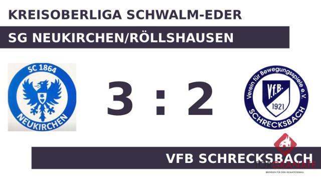 Der Gastgeber erwischte einen Blitzstart ins Spiel. Maximilian Walter traf in der sechsten Minute zur frühen Führung. Paul Ridinger war es, der in der 36. Minute das Spielgerät im Gehäuse des VfB Schrecksbach unterbrachte. Wenige Momente vor dem Seitenwechsel war Hannes Jungklaus mit dem 1:2 für die Gäste zur Stelle (42.). Zur Pause war die SG Neukirchen/Röllshausen im Fahrwasser und verbuchte eine knappe Führung. Mit dem Tor zum 3:1 steuerte Ridinger bereits seinen zweiten Treffer an diesem Tag bei (53.). Durch einen von Laurin Krämer verwandelten Elfmeter gelang dem VfB Schrecksbach in der 90. Minute der 2:3-Anschlusstreffer. Schließlich sprang für Neukirchen/Röllsh. gegen den VfB Schrecksbach ein Dreier heraus.