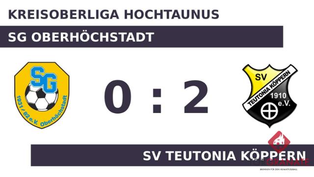 Joel Sousa Santos brachte die Gäste in der 14. Spielminute in Führung. Mit einem Tor Vorsprung für den SV Teutonia Köppern ging es für die beiden Teams nach dem Pausenpfiff in die Kabinen. Luka Milic brachte den Ball zum 2:0 zugunsten des SV Teutonia Köppern über die Linie (61.). Nach der Beendigung des Spiels durch den Unparteiischen Baghdad Chikar (Hattersheim am Main) feierte der SV Teutonia Köppern einen dreifachen Punktgewinn gegen die SG Oberhöchstadt.