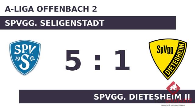 Die Heimmannschaft ging durch einen Elfmeter von Semir Arnautovic in Führung (10.). In der 33. Minute stellte die Spvgg. Dietesheim II personell um: Per Doppelwechsel kamen Deniz Sevgi und Ahmet Bayram auf den Platz und ersetzten Florian Kopp und Mohamed Riouch. Ehe der Unparteiische Tanja Hartmann (Breuberg) die Akteure zur Pause bat, erzielte Yasin Sinan aufseiten der Spvgg. Seligenstadt das 2:0 (43.). Mit der Führung für die Spvgg. Seligenstadt ging es in die Halbzeitpause. Für das 1:2 der Spvgg. Dietesheim II zeichnete Ben Bauer verantwortlich (50.). Arnautovic schnürte mit seinem zweiten Treffer einen Doppelpack und brachte seine Mannschaft auf die Siegerstraße (58.). Mathiyas Dursun legte in der 63. Minute zum 4:1 für die Spvgg. Seligenstadt nach. Der fünfte Streich der Spvgg. Seligenstadt war Arnautovic vorbehalten (85.). Letztlich feierte die Spvgg. Seligenstadt gegen die Spvgg. Dietesheim II nach einer überzeugenden Darbietung einen verdienten Heimsieg.