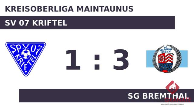 Die SG Bremthal erwischte einen Blitzstart ins Spiel. Lukas Kleber traf in der sechsten Minute zur frühen Führung. In der 20. Minute verwandelte Roman Glimm einen Elfmeter zum 2:0 für die Gäste. Ab der 30. Minute bereicherte der für Mehrshad Nazralikhalaj eingewechselte Jan-Erik Radtke den SV 07 Kriftel im Vorwärtsgang. Weitere Tore blieben bis zum Pfiff des Schiedsrichters aus. Somit ging es mit einem unveränderten Stand in die Halbzeitpause. Das 1:2 des SV 07 Kriftel bejubelte Moritz Dirnbeck (61.). Kurz vor Ultimo war noch Manuel Haas zur Stelle und zeichnete für das dritte Tor der SG Bremthal verantwortlich (82.). Letzten Endes ging die SG Bremthal im Duell mit dem SV 07 Kriftel als Sieger hervor.
