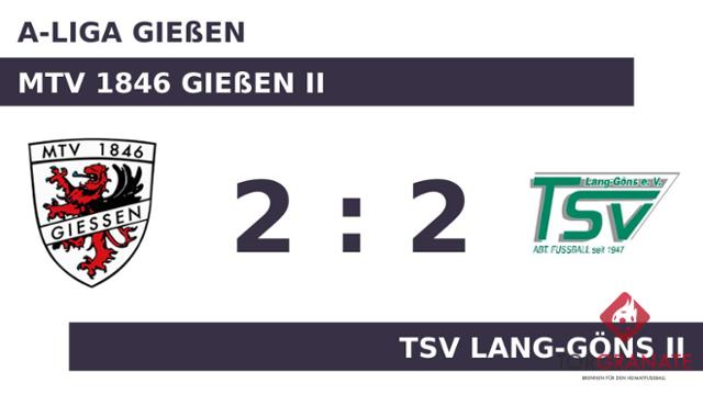Joshua Zaborowski brachte den TSV Lang-Göns II per Doppelschlag ins Hintertreffen, als er in der 26. und 40. Minute vollstreckte. Mit der Führung für den MTV 1846 Gießen II ging es in die Halbzeitpause. In Durchgang zwei lief Ali Ahmad Taheri anstelle von Giuseppe Aiello für den TSV Lang-Göns II auf. In der 66. Minute brachte Julian Scherer den Ball im Netz des MTV 1846 Gießen II unter. Die komfortable Halbzeitführung der Gastgeber hielt nicht bis zum Abpfiff, denn Nicolas Bredemeyer schoss den Ausgleich in der 82. Spielminute. Gedanklich hatte der MTV 1846 Gießen II den Sieg bereits sicher, doch eine famose Aufholjagd sicherte dem TSV Lang-Göns II am Ende noch den Teilerfolg.