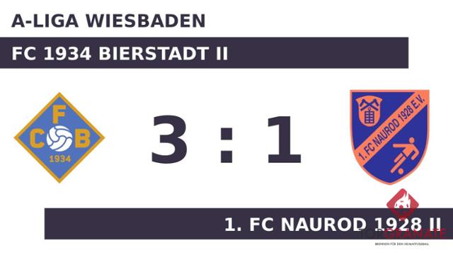 Der FC 1934 Bierstadt II erwischte einen Blitzstart ins Spiel. Yasin Dinler traf in der vierten Minute zur frühen Führung. Für Daniel Lauf war der Einsatz nach 14 Minuten vorbei. Für ihn wurde Patrick Sebischka eingewechselt. Mit der knappen Führung des FC Bierstadt II pfiff der Schiedsrichter zur Halbzeit. Friderico Platte ließ sich in der 47. Minute nicht zweimal bitten und verwertete zum 1:1 für den 1. FC Naurod II. In der 61. Minute stellten die Gäste personell um: Per Doppelwechsel kamen Benedikt Blumschein und Alexander Meier auf den Platz und ersetzten Jasper Cherdron und Till Quitzau. In der 77. Minute brachte Justin Mehrhof den Ball im Netz des 1. FC Naurod 1928 II unter. Florian Milbradt stellte wenige Minuten vor dem Schlusspfiff den Stand von 3:1 für den FC 1934 Bierstadt II her (86.). Zum Schluss feierte der FC Bierstadt II einen dreifachen Punktgewinn gegen den 1. FC Naurod II.