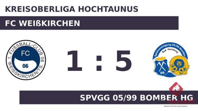 Der FC Weißkirchen geriet schon in der achten Minute in Rückstand, als Haben Gazae Embaye das schnelle 1:0 für die SpVgg 05/99 Bomber HG erzielte. In der Zeit bis zur Pause fiel kein weiteres Tor, es blieb bei der Führung für die SpVgg 05/99 Bomber. Für das zweite Tor der Gäste war Vincenzo Carotenuto verantwortlich, der in der 52. Minute das 2:0 besorgte. Gazae Embaye legte in der 60. Minute zum 3:0 für die SpVgg 05/99 Bomber HG nach. Pascal Metzger versenkte den Ball in der 65. Minute im Netz der SpVgg 05/99 Bomber. Für das 4:1 der SpVgg 05/99 Bomber HG sorgte Gazae Embaye, der in Minute 70 zur Stelle war. Carotenuto schraubte das Ergebnis in der 85. Minute mit dem 5:1 für die SpVgg 05/99 Bomber in die Höhe. Ein starker Auftritt ermöglichte der SpVgg 05/99 Bomber HG am Sonntag einen ungefährdeten Erfolg gegen den FC Weißkirchen.
