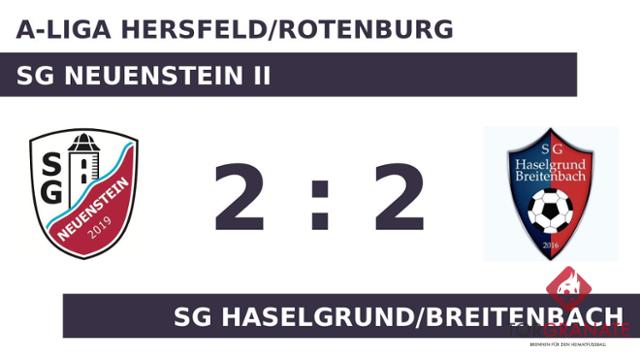 Marvin Köberich brachte sein Team in der 31. Minute nach vorn. Bei Haselgr./Breitenb. kam Arian Siegel für Marius Moeller ins Spiel und sollte fortan für neue Impulse sorgen (32.). Ohne dass sich am Stand noch etwas geändert hatte, verabschiedeten sich beide Mannschaften zur Pause in die Kabinen. Janis Huff war es, der in der 73. Minute das Spielgerät im Gehäuse der SG Haselgrund/Breitenbach unterbrachte. Das Spiel neigte sich seinem Ende entgegen, als Siegel einen Treffer für die Gäste im Ärmel hatte (81.). Timo Ziehn sicherte seiner Mannschaft kurz vor dem Abpfiff den Ausgleich, als er in der 86. Minute ins Schwarze traf. Letztlich trennten sich die SG Neuenstein II und Haselgr./Breitenb. remis.