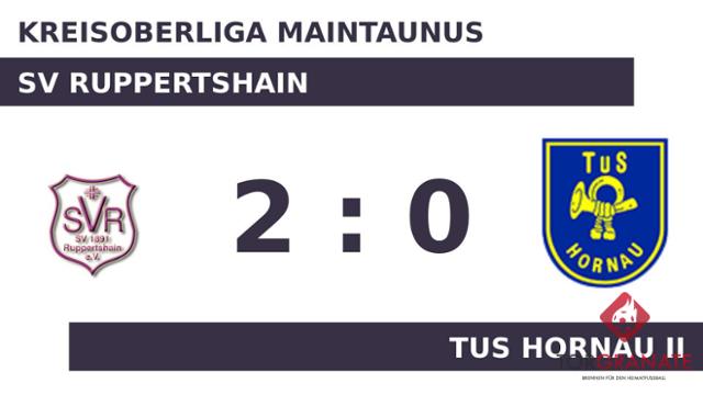 Nach nur 29 Minuten verließ Ivan Tadic von der TuS Hornau II das Feld, Marcel Schäfer kam in die Partie. Die erste Halbzeit endete ohne ein zählbares Ereignis für beide Mannschaften. Marc Thoma brach für den SV Ruppertshain den Bann und markierte in der 60. Minute die Führung. Matthias Rang schoss die Kugel zum 2:0 für die Gastgeber über die Linie (72.). In den 90 Minuten war der SV Ruppertshain im gegnerischen Strafraum erfolgreicher als die TuS Hornau II und fuhr somit einen 2:0-Sieg ein.