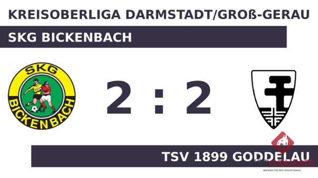 Simon Pfaff brachte den Gast in der 14. Minute nach vorn. Emre Yildirim war es, der in der 24. Minute den Ball im Tor des TSV 1899 Goddelau unterbrachte. Eine Aussage darüber, wer am Ende die Nase vorn haben würde, war nach dem Abpfiff der ersten Halbzeit noch nicht zu treffen. Es ging mit einem Gleichstand in die Kabinen. In Durchgang zwei lief Willy Eifler anstelle von Kevin Meininger für die SKG Bickenbach auf. Patrick Lange brachte dem TSV 1899 Goddelau nach 58 Minuten die 2:1-Führung. Den Freudenjubel des TSV 1899 Goddelau machte Lucas Anding zunichte, als er kurz darauf den Ausgleich besorgte (61.). Die 2:2-Punkteteilung war letztlich besiegelt, als Referee Sascha Böhm (Lützelbach) die Partie nach 90 Minuten abpfiff.