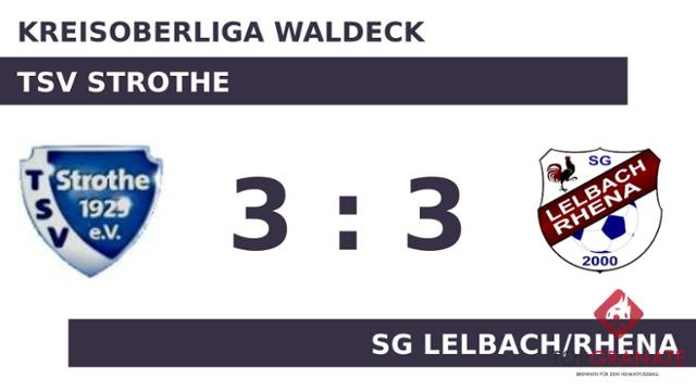 Timo Nawroth schoss in der 13. Minute vom Elfmeterpunkt das erste Tor des Spiels für den TSV Strothe. In der 26. Minute erhöhte Ilir Gashi auf 2:0 für den Gastgeber. Nils Schapeler verkürzte für die SG Lelbach/Rhena später in der 38. Minute auf 1:2. Kurz vor dem Pfiff zur Halbzeit machte Nico Mannweiler das 3:1 zugunsten des TSV Strothe (41.). Mit der Führung für den TSV Strothe ging es in die Halbzeitpause. Für das zweite Tor der SG Lelbach/Rhena war Patrick Messner verantwortlich, der in der 72. Minute das 2:3 besorgte. Die komfortable Halbzeitführung des TSV Strothe hielt nicht bis zum Abpfiff, denn Tobias Schumann schoss den Ausgleich in der 83. Spielminute. Am Ende stand es zwischen dem TSV Strothe und der SG Lelbach/Rhena pari.