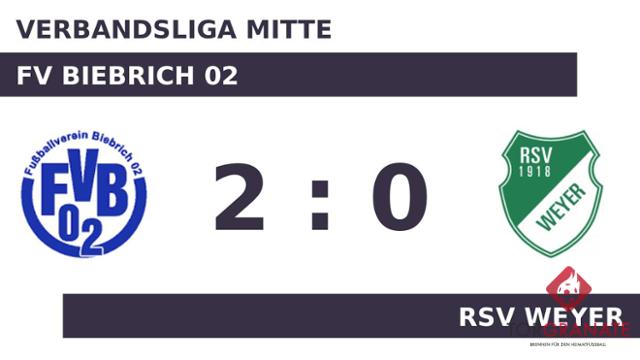 Der FV Biebrich 02 ging durch Orkun Zer in der 35. Minute in Führung. Zur Pause behielten die Biebricher die Nase knapp vorn. Wenig später kamen Dennis Dietrich und Mohammed Amin Al Mohammad per Doppelwechsel für Manuel Ulm und Andreas Petri auf Seiten des RSV Weyer ins Match (67.). Mit dem 2:0 sicherte Zer dem FV Biebrich 02 nicht nur den Sieg, sondern erzielte auch seinen zweiten Tagestreffer (82.). Als Schiedsrichter Fabian Bierau (Lahntal) die Partie abpfiff, reklamierten die Nullzweier schließlich einen 2:0-Heimsieg für sich.