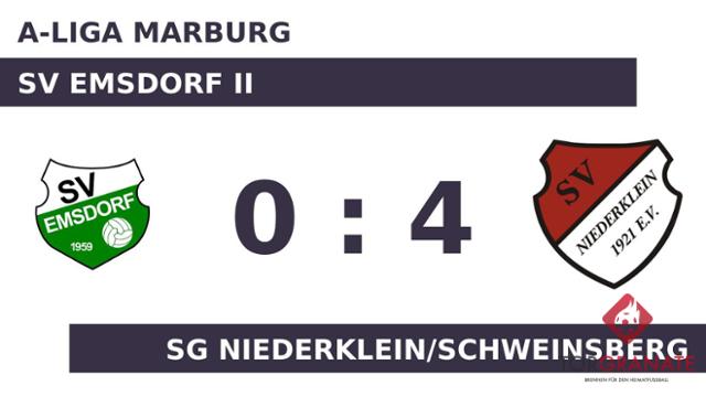 Ein frühes Ende hatte das Spiel für Yasar Naziyok von der SG Niederklein/Schweinsberg, der in der zehnten Minute vom Platz musste und von Fynn Botthof ersetzt wurde. Für den Führungstreffer der Niederk./Schweinsb. zeichnete Turgay Yildiz verantwortlich (13.). Botthof versenkte die Kugel zum 2:0 für die SG Niederklein/Schweinsberg (35.). Es waren die Gäste, die zur Pause eine Führung ihr Eigen nannten. Jody Pierri brachte die Niederk./Schweinsb. in ruhiges Fahrwasser, indem er das 3:0 erzielte (49.). Eigentlich war der SV Emsdorf II schon geschlagen, als Florian Maus das Leder zum 0:4 über die Linie beförderte (64.). Mit dem Schlusspfiff durch Referee Jürgen Komorowski (Marburg) siegte die SG Niederklein/Schweinsberg gegen den SV Emsdorf II.