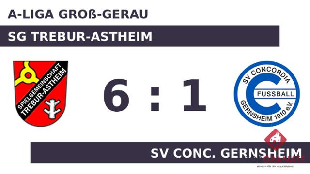 Patrick Sohn stellte die Weichen für die SG Trebur-Astheim auf Sieg, als er in Minute 18 mit dem 1:0 zur Stelle war. Jan Feth verwandelte in der 22. Minute einen Elfmeter und baute den Vorsprung der Heimmannschaft auf 2:0 aus. Kurz vor dem Seitenwechsel legte Philipp Traupel das 3:0 nach (40.). Der Halbzeitpfiff war noch nicht ertönt, als Feth seinen zweiten Treffer nachlegte (45.). Das überzeugende Auftreten der SG Trebur-Astheim fand Ausdruck in einer klaren Halbzeitführung. Pascal Sattler erzielte in der 51. Minute den Ehrentreffer für den SV Conc. Gernsheim. Die Vorentscheidung führten Marcel Geisler (84.) und Justin Auth (89.) mit zwei Toren innerhalb weniger Minuten herbei. Am Ende fuhr die SG Trebur-Astheim einen deutlichen Sieg ein. Dabei demonstrierte die SG Trebur-Astheim bereits in Hälfte eins großes Leistungsvermögen, als man den SV Conc. Gernsheim in Grund und Boden spielte.