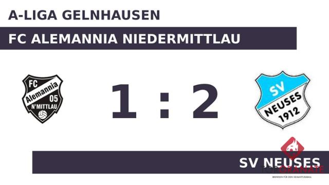 Pascal Dornhecker brachte den SV Neuses in der zwölften Minute in Front. Ivan Dorosenco witterte seine Chance und schoss den Ball zum 1:1 für die Alem. Niedermittlau ein (25.). Zur Halbzeit war die Partie noch vollkommen offen. Remis lautete das Zwischenresultat. In Durchgang zwei lief Yusuf Senlikoglu anstelle von Alexander Jakobe für den SV Neuses auf. Der Treffer zum 2:1 sicherte dem SVN nicht nur die Führung – es war auch bereits der zweite von Dornhecker in diesem Spiel (61.). Schließlich holte der Gast gegen den direkten Abstiegskonkurrenten die Big Points und feierte einen 2:1-Sieg.