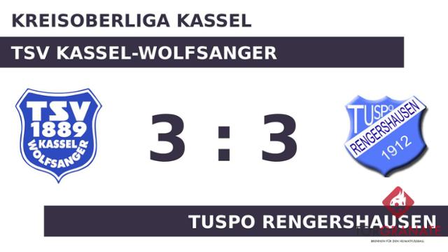 In der 18. Minute fiel der Führungstreffer für den Tuspo Rengershausen per Eigentor. Für das 2:0 des Gasts zeichnete Manuel Schmidt verantwortlich (25.). Das 1:2 des TSV Kassel-Wolfsanger bejubelte Lukas Haack (32.). Mit einem Tor Vorsprung für den Tuspo Rengershausen ging es für die beiden Teams in die Halbzeitpause. Kristijan Jurecivic erhöhte für den Tuspo Rengershausen auf 3:1 (48.). Haack schlug doppelt zu und glich damit für den TSV Wolfsanger aus (81./83.). Schließlich gingen der TSV Kassel-Wolfsanger und der Tuspo Rengershausen mit einer Punkteteilung auseinander.